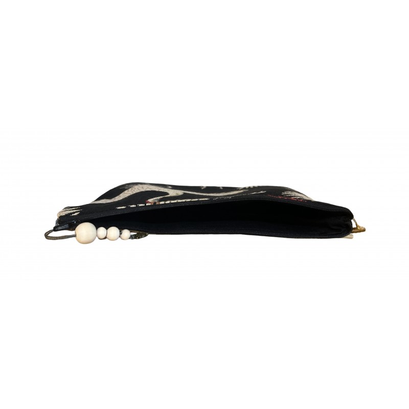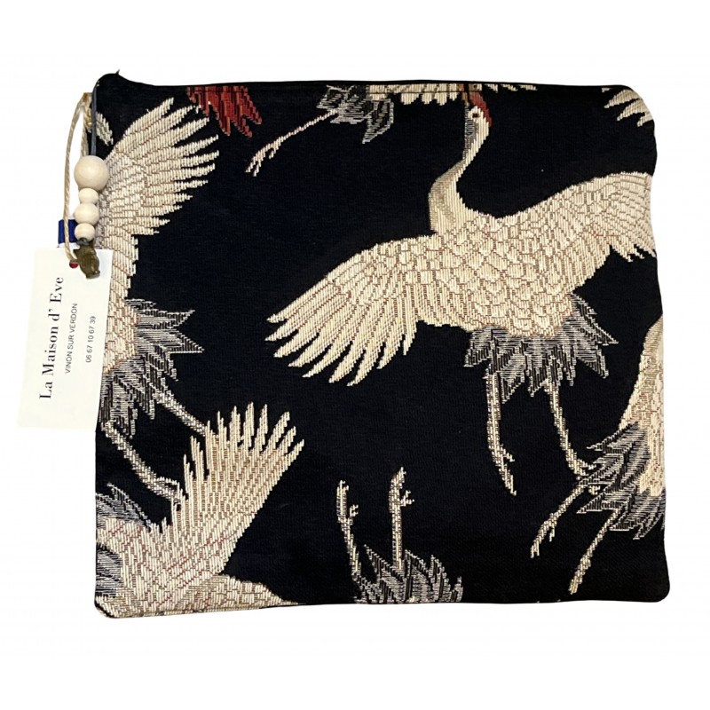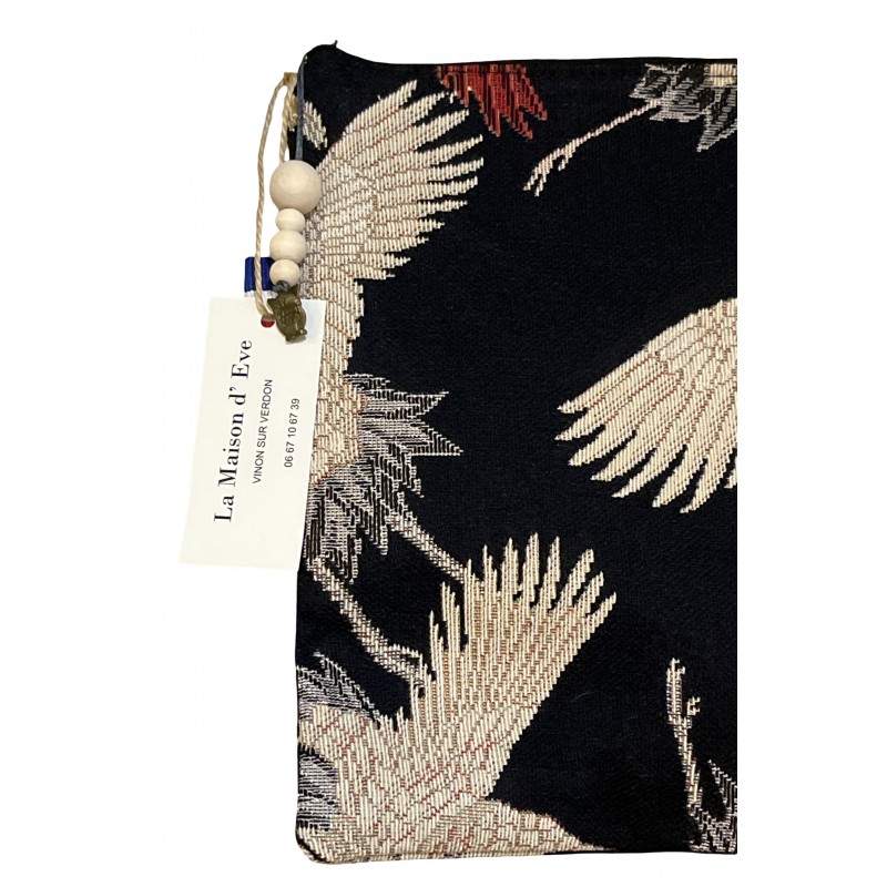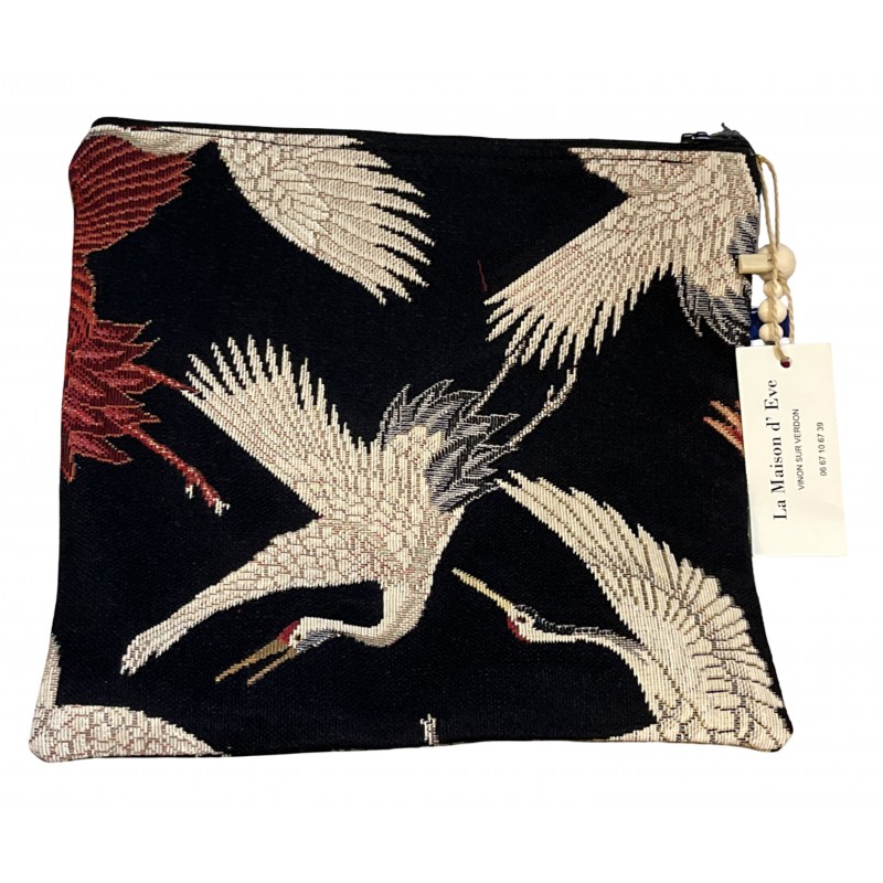 Elégante et robuste , cette pochette grand format en tissage Jacquard célèbre l'art traditionnel avec ses motifs de grues en plein envol. UN accessoire artisanal indispensable pour organiser vos effets personnels avec style